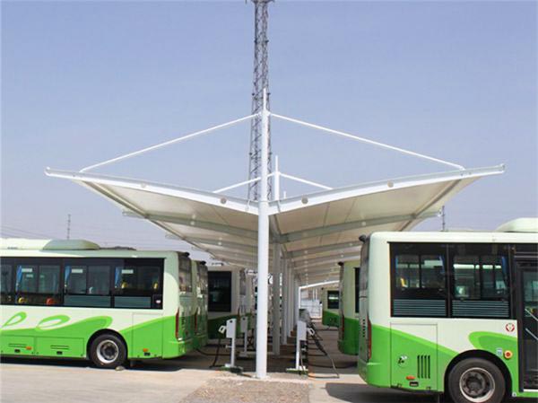 1、膜结构充电桩车棚是21世纪具代表性与充满前途的建筑形式。它打破了纯直线建筑风格的模式,以其独有的优美曲面造型,简洁、明快、刚与柔、力与美的组合,呈现给人以耳目一新的感觉,同时给建筑设计师提供了更大的想象和创造空间。建筑造型优美,具有良好的环保性、透光性、自清洁性,膜材表面采用PVDF(聚偏二氟乙烯)涂层、或二氧化钛涂层,具有较好的隔热效果,对太阳热能可反射掉70%,膜材本身吸收了17%,传热13%,而透光率却在20%以上,经过10年的太阳光直接照射,其辉度仍能保留70%。