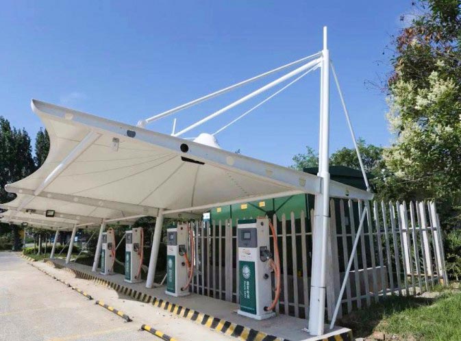 1、膜结构充电桩车棚是21世纪具代表性与充满前途的建筑形式。它打破了纯直线建筑风格的模式,以其独有的优美曲面造型,简洁、明快、刚与柔、力与美的组合,呈现给人以耳目一新的感觉,同时给建筑设计师提供了更大的想象和创造空间。建筑造型优美,具有良好的环保性、透光性、自清洁性,膜材表面采用PVDF(聚偏二氟乙烯)涂层、或二氧化钛涂层,具有较好的隔热效果,对太阳热能可反射掉70%,膜材本身吸收了17%,传热13%,而透光率却在20%以上,经过10年的太阳光直接照射,其辉度仍能保留70%。