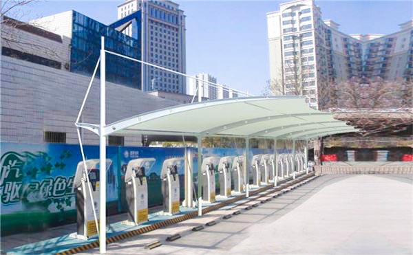 1、膜结构充电桩车棚是21世纪具代表性与充满前途的建筑形式。它打破了纯直线建筑风格的模式,以其独有的优美曲面造型,简洁、明快、刚与柔、力与美的组合,呈现给人以耳目一新的感觉,同时给建筑设计师提供了更大的想象和创造空间。建筑造型优美,具有良好的环保性、透光性、自清洁性,膜材表面采用PVDF(聚偏二氟乙烯)涂层、或二氧化钛涂层,具有较好的隔热效果,对太阳热能可反射掉70%,膜材本身吸收了17%,传热13%,而透光率却在20%以上,经过10年的太阳光直接照射,其辉度仍能保留70%。
